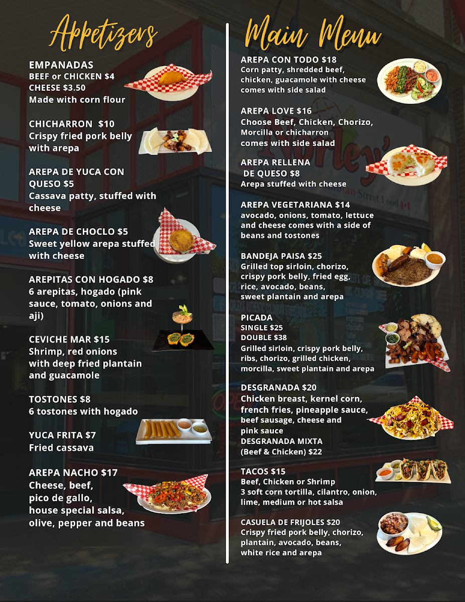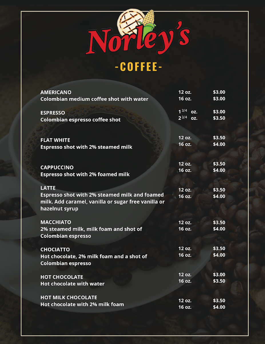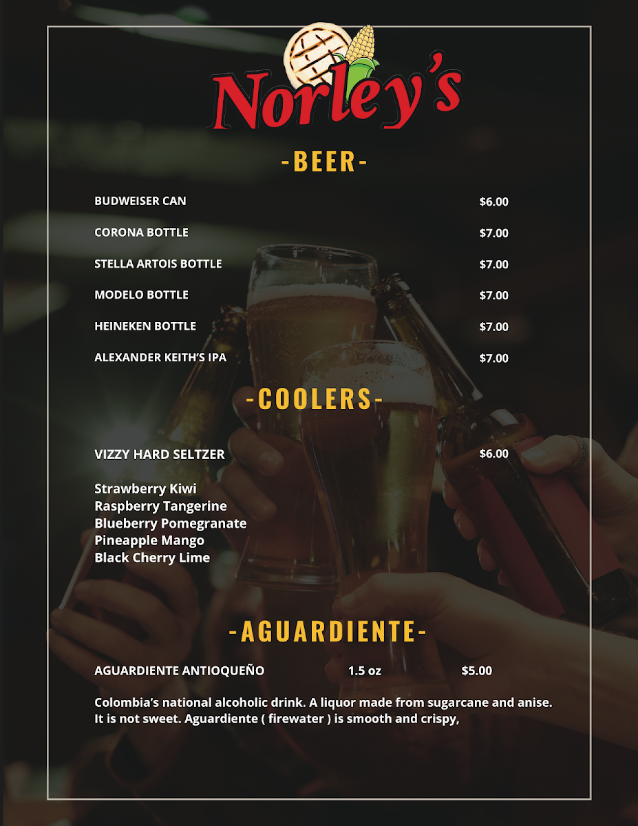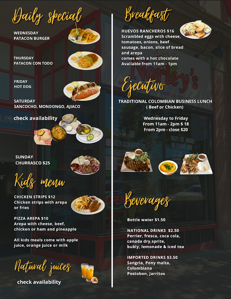 At Norley's Authentic Colombian Street Food, the menu offers a delightful array of flavorful dishes that showcase the essence of Colombian cuisine. The appetizers include a variety of street food-inspired treats such as Arepa de Choclo (sweet corn cake) and Empanadas (fried pastries filled with meat or cheese), setting the stage for an authentic experience. The main menu features classic Colombian dishes like the hearty Bandeja Paisa ($20), a signature dish loaded with beans, rice, plantain, chorizo, and steak, while the Ajiaco ($17) is a comforting chicken soup with corn and potatoes. For something lighter, there’s the Arroz con Pollo ($15), a flavorful chicken and rice dish. The Daily Specials offer rotating options, keeping the menu fresh and exciting, while the drink selection includes local beers and Colombian beverages, paired perfectly with any dish. Whether you’re in the mood for a satisfying meal or just a quick snack, Norley’s delivers a taste of Colombia in every bite, making it a must-visit for lovers of authentic street food.